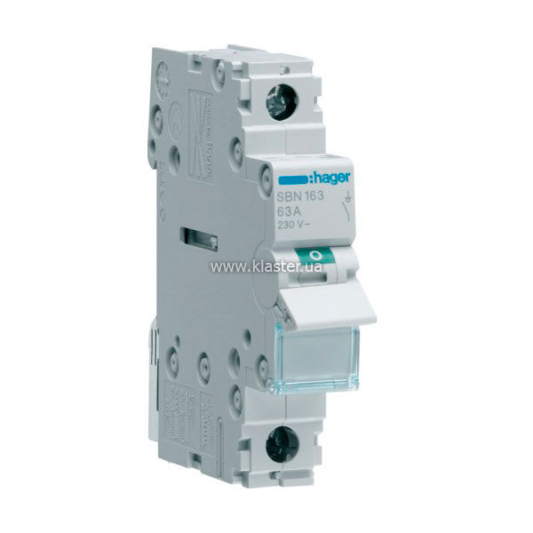 Выключатель нагрузки Hager 1-полюсный 63А/230В - низковольтный коммутационный аппарат, разработанный для интеграции в современные системы распределения электроэнергии жилого и коммерческого назначения. Конструктивное исполнение SBN163 выполнено в компактном одномодульном формате шириной 17,5 мм, что оптимизирует использование пространства на DIN-рейке. Корпус изделия изготовлен из высококачественного тугоплавкого термопласта, устойчивого к термическим деформациям и обладающего высокими диэлектрическими свойствами. Механизм управления оснащен эргономичной рукояткой серого цвета, которая имеет четкую индикацию положения контактов: верхнее положение соответствует замкнутому состоянию (I), нижнее — разомкнутому (0).