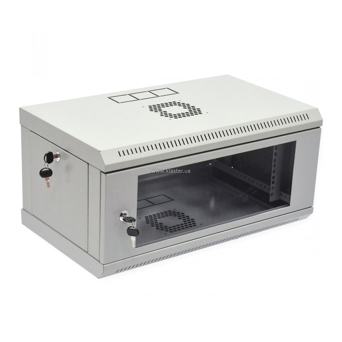 В верхней и нижней панелях предусмотрены перфорированные отверстия для пассивной вентиляции. Если оборудование выделяет много тепла, в шкафу предусмотрены штатные места для установки активных вентиляторных модулей. Для защиты оборудования от статического электричества предусмотрены точки подключения заземления. Светло-серый цвет (RAL 7035) делает шкаф визуально менее громоздким, позволяя ему гармонично смотреться на светлых стенах современных интерьеров. Боковые панели корпуса выполнены несъемными, что повышает общую жесткость конструкции при ее небольшом весе. Передняя дверь может быть перевешена для открытия как в левую, так и в правую сторону (угол открытия — более 180°), что критически важно при установке в узких коридорах или нишах.