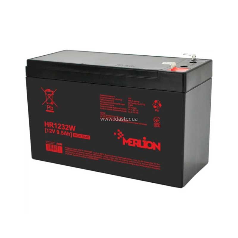 Свинцево-кислотний акумулятор MERLION HR1232W, 12V 9,5Ah Q10/420 має широкий спектр застосування. Корпус даної батареї виготовлений із міцного високоякісного матеріалу із стійкістю до дії ультрафіолетового вивчення. Пофарбована поверхня у чорний колір. Підключення здійснюється через накидні клемники сто розташовані на верхній частині виробу. Номінальна напруга складає 12 Вольт. Щоб уникнути порушення цілісності корпусу, виконувати зарядку необхідно строго за інструкцією.