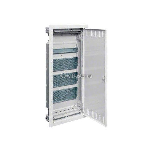 Пластикова основа має високу діелектричну міцність, а сталева зовнішня рама з порошковим покриттям білого кольору забезпечує естетичний вигляд і довговічність. Збільшений обсяг ідеальний для об'єктів з розгалуженою мережею «розумного будинку», де потрібне акуратне укладання численних джгутів з дотриманням радіусів вигину. Знімні панелі для введення кабелів із попередньо наміченими отворами спрощують монтаж у ніші з будь-яких матеріалів. Можливість перенавішування дверцят дозволяє адаптувати щит під особливості планування конкретної зони установки.
