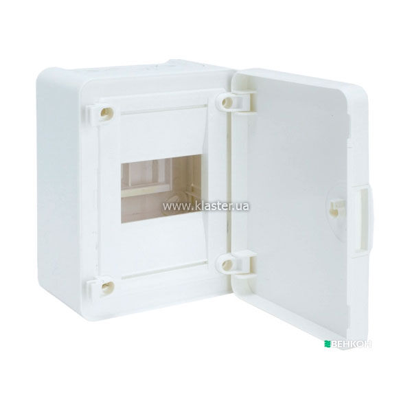 Глухі білі дверцята з кутом відкривання 180° оснащені механізмом, що самозащіпається, повністю приховує модульне обладнання і зберігає естетичний вигляд інтер'єру. Введення кабелю передбачене через попередньо намічені зони у верхній та нижній частинах основи, що дозволяє акуратно підводити кабель-канали або гофротруби без порушення жорсткості конструкції. Пластик корпусу стійкий до ультрафіолетового випромінювання та теплових навантажень до 650°C, не жовтіє та зберігає діелектричні властивості протягом усього терміну служби. Габаритні розміри щита мінімізовані для економії простору, при цьому внутрішній об'єм достатній для радіусу згину силових дротів 16 мм.