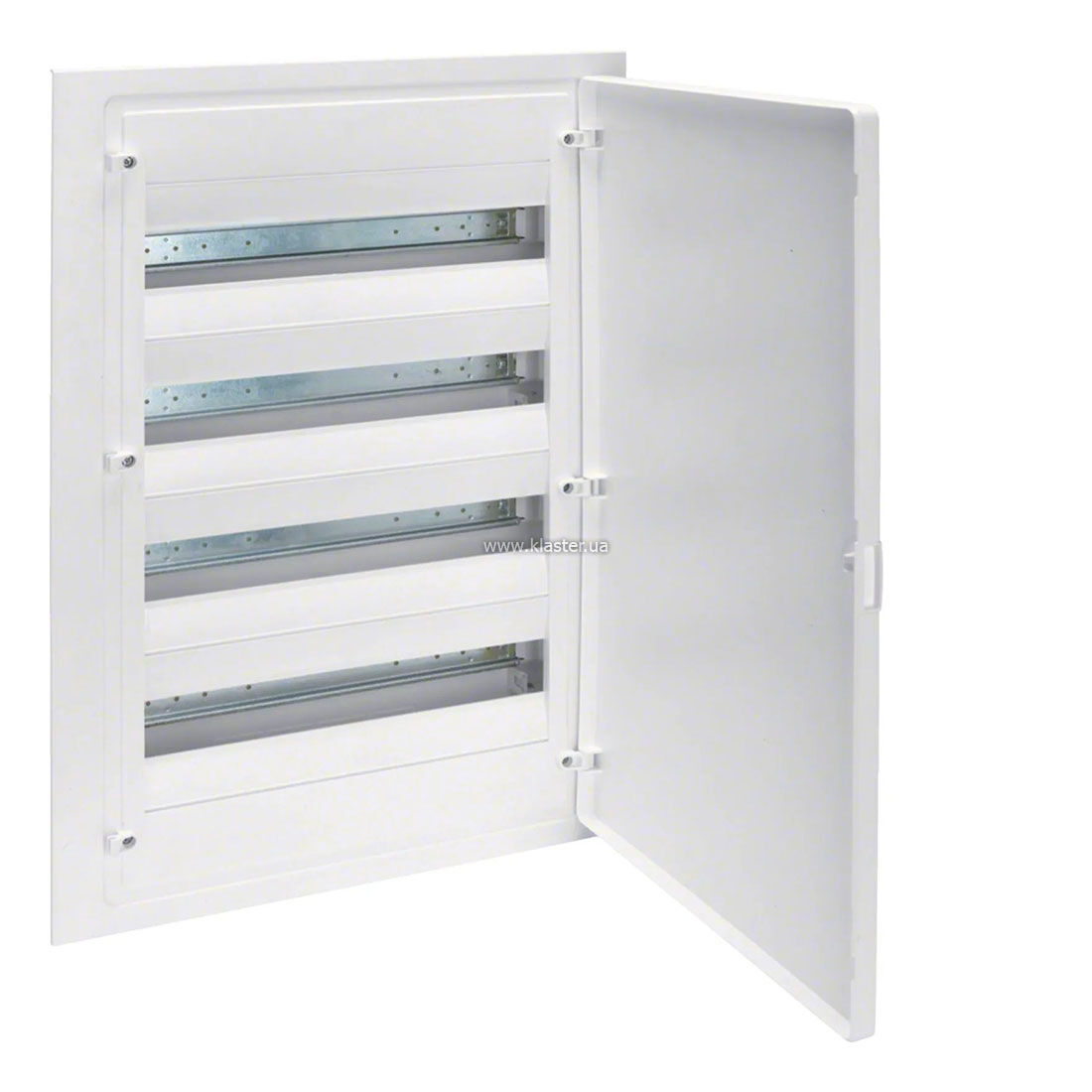 Суцільні білі дверцята забезпечені реверсивними петлями, що дає можливість змінювати бік відкривання (ліво/право) та забезпечує кут розкриття 180 градусів. Для підведення ліній у корпусі передбачені зони навмисного зламу під різні діаметри труб та кабелів. Габаритні розміри ніші для встановлення становлять 647х426х72 мм. Незважаючи на значну ємність, щит зберігає естетичний вигляд завдяки плоскій лицьовій панелі та якісному білому пластику, що дозволяє встановлювати його в житлових та адміністративних приміщеннях з високими вимогами до дизайну.
